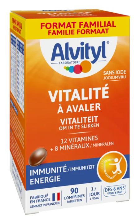 Alvityl® Vitalité à avaler est une association complète de 12 vitamines et 8 minéraux afin de couvrir 100% des apports de toute la famille dès 6 ans. Les comprimés saveur chocolat permettent de faciliter la prise des plus jeunes et des adultes. Le format de 90 comprimés est également disponible pour satisfaire toute la famille.