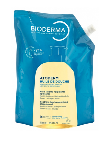 Bioderma Atoderm Huile de Douche Éco-Recharge 1 Litre est une base lavante douce sous forme d'huile de douche à la texture onctueuse et non grasse. Elle nettoie en douceur les peaux sensibles sèches, très sèches à irritées. Sa formule composée de 33% d'agents relipidants et hydratants renforce durablement la barrière cutanée, apaise les sensations de tiraillement et protège des agressions extérieures.