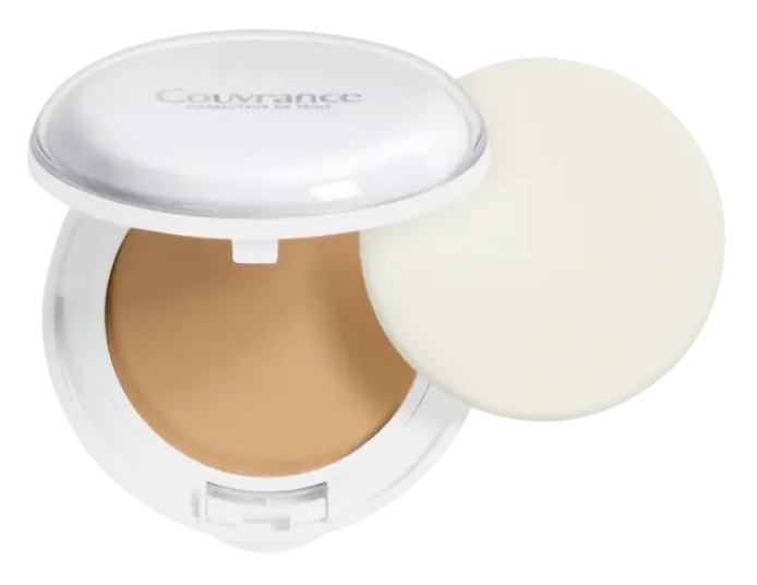 Couvrance Crème de teint compacte Confort Sable unifie les peaux sensibles, claires à dorées, et couvre efficacement les imperfections cutanées sévères.