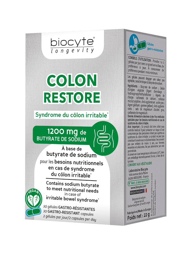 COLON RESTORE® est adapté aux besoins nutritionnels des personnes ayant un syndrome du côlon irritable. C’est un DADFMS soumis à une réglementation stricte, apportant 1200mg de sodium butyrate par jour.
