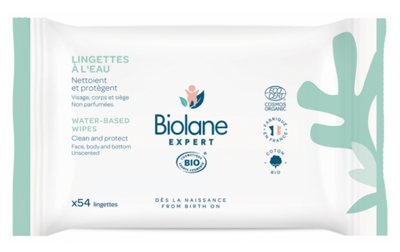 Biolane Expert Lingettes à l'Eau 54 Lingettes sont des lingettes qui nettoient et protègent en un seul geste le visage, le corps et le siège du bébé.