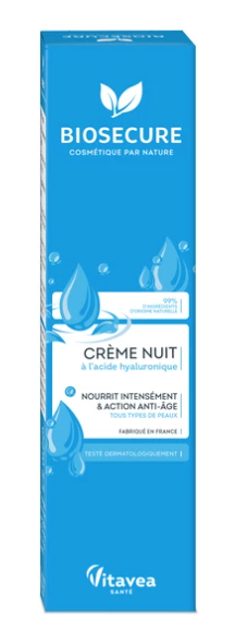 La Crème de nuit bio à l’acide hyaluronique Biosecure est un soin visage anti-âge formulé pour aider à atténuer les signes du vieillissement. Avec le temps, la peau produit moins d’acide hyaluronique, un actif essentiel à son hydratation et à sa fermeté : elle perd alors en éclat et en élasticité, se relâche, et les rides et ridules se marquent davantage. Pour soutenir la peau pendant la nuit et favoriser une sensation de peau plus rebondie au réveil, Biosecure a développé cette crème de nuit à l’acide hyaluronique.
