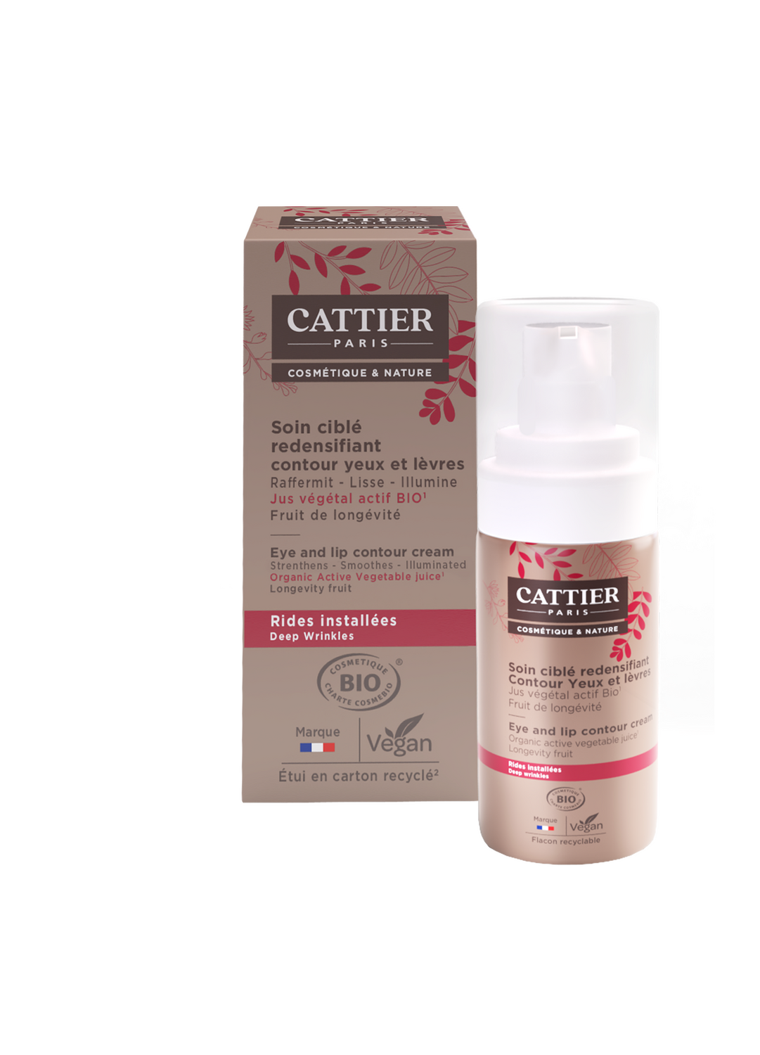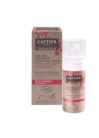 Ce soin anti-âge bio se concentre sur le contour des yeux et des lèvres. Il permet de défroisser et raffermir la peau, lisser les rides (patte d'oie, ride du lion, sillons nasogéniens...), apporter de l'éclat et atténuer les marques de fatigue. Sa formule, d'origine naturelle et certifiée bio, repose sur un jus végétal actif obtenu à partir d'un extrait de mirabelles bio et de jus d'aloe vera bio. A cela s'ajoutent des extraits d'algues rouges et vertes qui vont améliorer la fermeté de la peau, décongestionner et réactiver la microcirculation. Ce soin contour yeux et lèvres Cattier contient également de l'argile verte, aux propriétés régénérantes, et de l'extrait de fruit de longévité qui contribue à renforcer durablement le capital jeunesse de la peau. Doté d'une texture onctueuse, le soin ciblé redensifiant yeux et lèvres Cattier garantit des résultats visibles : les rides sont comblées, les cernes éclaircis et les poches sont réduites.