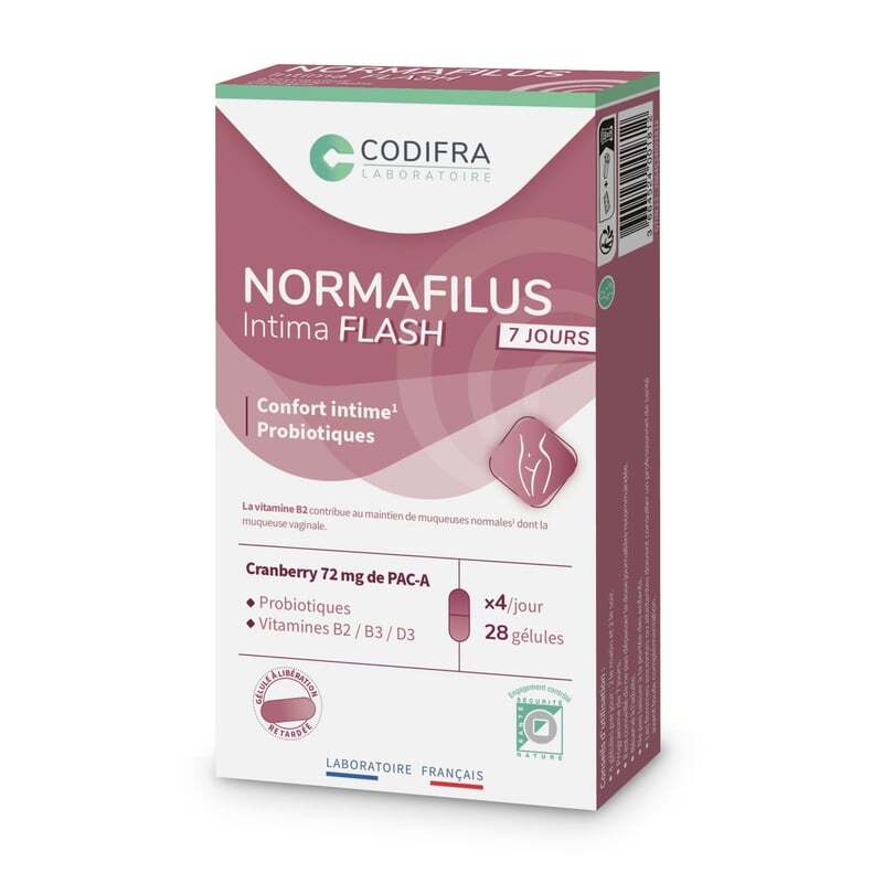 DescriptionUn coup de pouce naturel pour votre équilibre intimeNormafilus Intima Flash est une solution innovante conçue pour soutenir le confort intime féminin au quotidien. Ce complément alimentaire associe des actifs soigneusement sélectionnés pour leur efficacité, comme la cranberry hautement concentrée en PAC-A, des probiotiques et des vitamines essentielles. Une formule pensée pour agir en profondeur, avec une libération prolongée des actifs grâce à ses gélules végétales à libération retardée. Une formule complète pour un soutien cibléAvec 72 mg de PAC-A issus de la cranberry, Normafilus Intima Flash mise sur un actif reconnu pour son rôle dans le maintien dun équilibre intime sain. La formule est enrichie en probiotiques (10 milliards dUFC par dose journalière) pour favoriser une flore intime équilibrée, tandis que les vitamines B2, B3 et D3 apportent un soutien supplémentaire aux muqueuses et au système immunitaire. Un programme de 7 jours pour une action rapide et efficace. Des ingrédients soigneusement choisis pour votre bien-êtreNormafilus Intima Flash est formulé sans colorants ni allergènes, avec des ingrédients dorigine végétale. Ses gélules à libération retardée permettent une diffusion optimale des actifs dans lorganisme, pour une efficacité maximale. Un complément alimentaire pratique et facile à intégrer dans votre routine, avec une posologie simple : 4 gélules par jour, à prendre en deux fois. CODIFRA est une marque française engagée dans le développement de compléments alimentaires innovants, alliant science et naturalité. Spécialisée dans les solutions pour le bien-être féminin, la marque mise sur des formules efficaces, élaborées avec des actifs de qualité et des procédés de fabrication rigoureux. CODIFRA sattache à proposer des produits sûrs, sans compromis sur la transparence et la traçabilité des ingrédients.Liste des avantages du produitConfort intime optimal Cranberry hautement dosée Probiotiques à 10 milliards Libération prolongée des actifs Sans colorants ni allergènes Vitamines B2, B3 et D3Conseils d'utilisationPour une utilisation optimale de Normafilus Intima Flash, prenez 4 gélules par jour pendant 7 jours, réparties en 2 gélules le matin et 2 gélules le soir, de préférence au cours des repas. Les gélules à libération retardée permettent une diffusion progressive des actifs pour une efficacité renforcée. Ce complément alimentaire est conçu pour être pris en cure d'une semaine, sans dépasser la durée recommandée. Veillez à bien respecter la posologie indiquée pour profiter pleinement des bienfaits des cranberries, probiotiques et vitamines qu'il contient.CompositionExtrait de fruit de cranberry (Vaccinium macrocarpon) (Source de PAC-A : 72 mg pour 4 gélules) - Lactobacillus acidophilus La-14 (8 milliards dUFC pour 4 gélules) - Lacticaseibacillus rhamnosus HN001 (2 milliards dUFC pour 4 gélules) - Vitamine B2 (riboflavine) - Vitamine B3 (nicotinamide) - Vitamine D3 (cholécalciférol) (origine végétale : lichen) - Hydroxypropylméthylcellulose (Agent denrobage : gélule végétale à libération retardée) - Stéarate de magnésium (Anti-agglomérant) - Maltodextrine (Support pour probiotiques)