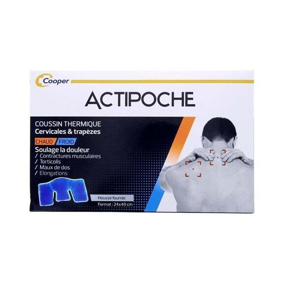 DescriptionUn soulagement ciblé et naturel pour vos tensions cervicales et trapèzesDites adieu aux douleurs musculaires tenaces avec lACTIPOCHE CERVICALES ET TRAPÈZES de Cooper, un coussin thermique innovant qui combine efficacité et simplicité. Conçu pour sadapter parfaitement à la nuque et aux épaules, ce dispositif de 24 x 40 cm offre une solution polyvalente pour apaiser les contractures, les torticolis ou les raideurs liées au stress ou à une mauvaise posture. Son gel réutilisable permet une utilisation en chaud ou en froid, selon vos besoins, sans recourir aux médicaments. Thermothérapie et cryothérapie : deux solutions en un seul produitQue vous souffriez dune inflammation, dune élongation ou simplement de tensions accumulées, ce coussin sadapte à chaque situation. En mode chaud (au micro-ondes ou à leau bouillante), il détend les muscles en profondeur, stimule la circulation sanguine et soulage les douleurs chroniques comme les lumbagos ou les règles douloureuses. En mode froid (au réfrigérateur ou congélateur), il réduit les gonflements, les hématomes et les maux de tête en quelques minutes seulement. Une solution économique et écologique, réutilisable à linfini. Pratique, sûr et adapté à toute la familleLACTIPOCHE CERVICALES ET TRAPÈZES est pensé pour un usage quotidien, que ce soit à la maison, au bureau ou en déplacement. Sa housse en polyester garantit un contact doux et confortable avec la peau, tandis que son format ergonomique épouse parfaitement les courbes de la nuque et des épaules. Léger (moins d1 kg) et facile à préparer, il devient un allié indispensable pour toute la famille, des adolescents aux seniors. Plus besoin de multiplier les produits : un seul coussin suffit pour traiter une multitude de maux. Cooper est une marque française reconnue pour ses solutions de santé et de bien-être accessibles à tous. Depuis des décennies, elle mise sur linnovation et la qualité pour proposer des produits simples, efficaces et adaptés aux besoins du quotidien. Que ce soit pour soulager les douleurs, améliorer le confort ou accompagner les soins, Cooper allie expertise médicale et praticité pour offrir des solutions fiables, testées et approuvées par les utilisateurs.Liste des avantages du produitSoulage les douleurs cervicales Idéal pour trapèzes tendus Thérapie chaud et froid Réutilisable et économique Sans médicament, naturel Housse confortable incluseConseils d'utilisationPour utiliser l'Actipoche Cervicales et Trapèzes Cooper, commencez par choisir le type de traitement adapté à votre besoin : chaud pour détendre les muscles et soulager les contractures, ou froid pour réduire les inflammations et les douleurs aiguës. Pour une application chaude, placez le coussin au micro-ondes pendant 20 secondes à 1000 W ou plongez-le dans de l'eau bouillante pendant 1 minute. Pour une application froide, laissez-le au réfrigérateur pendant 2 heures ou au congélateur pendant 50 minutes. Appliquez ensuite le coussin sur la zone cervicale ou les trapèzes pendant 20 à 30 minutes pour le chaud, et 20 minutes pour le froid. Veillez à toujours utiliser la housse de protection fournie pour un confort optimal et une hygiène irréprochable. Ce coussin est réutilisable et sans médicament, idéal pour toute la famille.CompositionGlycérine - Propylène glycol - Carboxyméthylcellulose (Stabilisant) - Bronopol (Conservateur) - CMIT (Conservateur) - MIT (Conservateur) - Colorant - Eau - Housse : 100 % Polyester