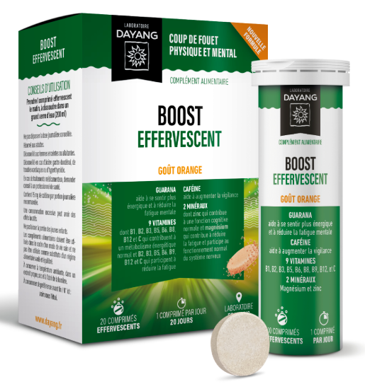 Pour 1 comprimé effervescent : vitamines B1 1,4 mg (127%*), B2 1,6 mg (114%*), B3 18 mg (112,5%*), B5 6 mg (100%*), B6 2 mg (143%*), B8 150 µg (300%*), B9 200 µg (100%*), B12 1 µg (40%*), C 60 mg (75%*), extrait de graine de guarana 121,1 mg dont caféine 26,64 mg, caféine anhydre 48,36 mg (soit caféine totale : 75 mg), magnésium 100 mg (26,7%*) et zinc 9,5 mg (95%*).