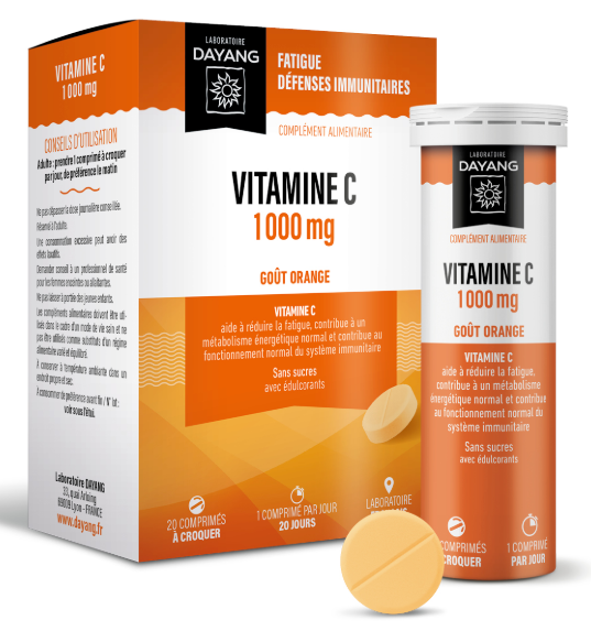 Pour 1 comprimé par jour : Agent de charge : sorbitol, acide ascorbique et ascorbate de sodium (vitamine C : 1000 mg soit 1250% AR*), arôme naturel orange avec autres arômes naturels, anti-agglomérant : sels de magnésium d'acides gras, édulcorant : sucralose, colorant : riboflavine, édulcorants : saccharinate de sodium, acésulfame de potassium *AR : Apports de Référence.