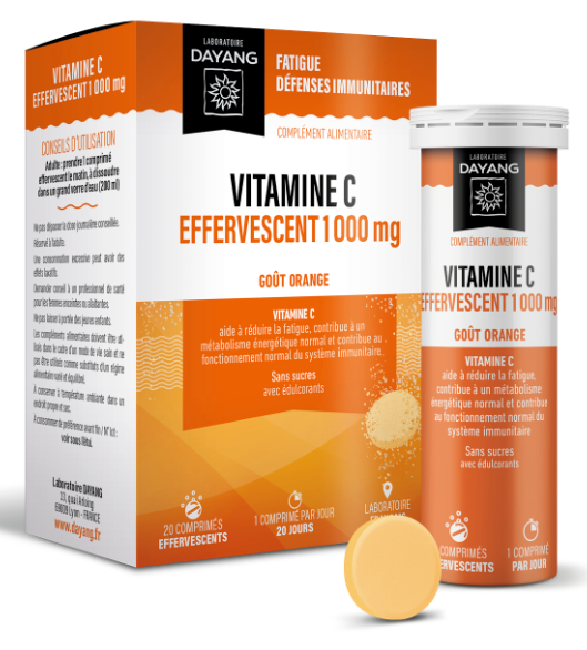 Pour 1 comprimé effervescent par jour : Agent de charge : sorbitol, acide ascorbique et ascorbate de sodium (vitamine C : 1000 mg soit 1250% AR*), arôme naturel orange avec autres arômes naturels, anti-agglomérant : sels de magnésium d'acides gras, édulcorant : sucralose, colorant : riboflavine, édulcorants : saccharinate de sodium, acésulfame de potassium *AR : Apports de Référence.