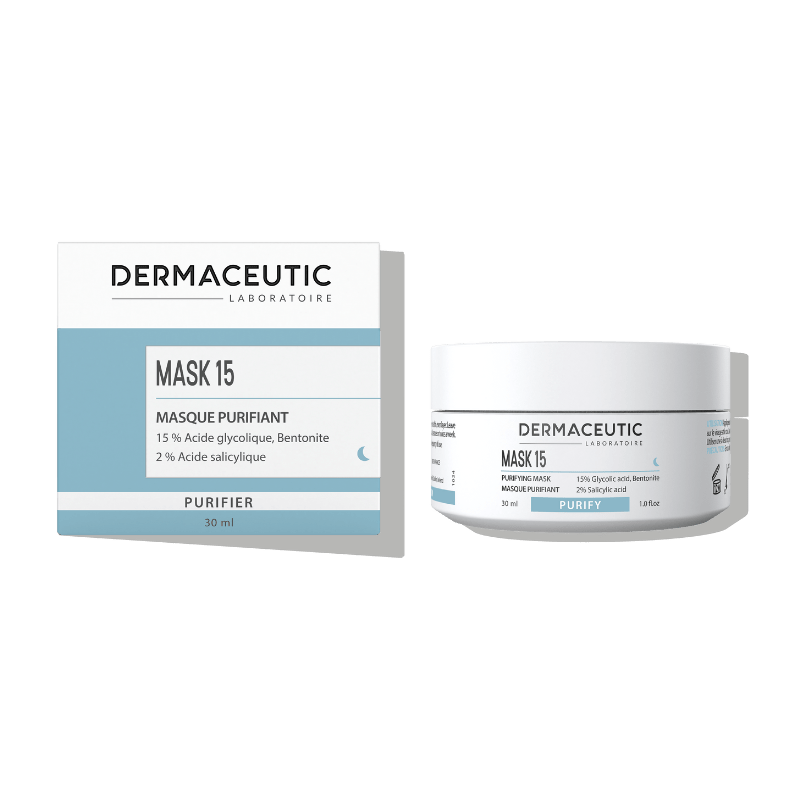 Dermaceutic Mask 15 Purifiant 30ml est un Peeling doux sous forme argileuse, purifie la peau en éliminant les imperfections et les cellules mortes. Il permet de réduire l’excès de sébum et l’apparition de pores dilatés, élimine les points noirs et assèche les boutons pour une peau débarrassée de son aspect brillant.