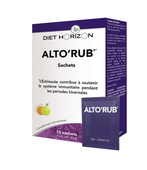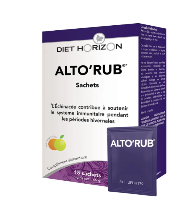 Diet Horizon vous propose ALTORUB COMPRIMÉS une formule complète à base de 8 extraits secs de plantes dont l'Échinacée et l'Astragale, de vitamine C et de Zinc qui soutiennent le système immunitaire en hiver. La Vitamine C contribue également à la réduction de la fatigue.