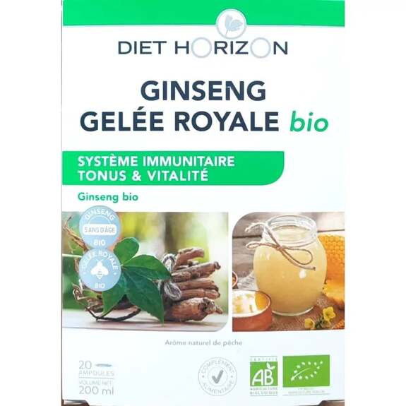 DescriptionUn coup de boost naturel pour affronter vos journées avec énergieDécouvrez DIET HORIZON Gins Gelée Royale Bio, un complément alimentaire sous forme dampoules buvables, conçu pour vous accompagner dans les périodes de fatigue, de stress ou lorsque votre corps a besoin dun soutien supplémentaire. Avec ses 20 ampoules pratiques et faciles à emporter, ce produit allie deux ingrédients stars de la médecine naturelle : le ginseng rouge bio, cultivé pendant 6 ans pour une concentration optimale en principes actifs, et la gelée royale bio, réputée pour ses vertus revitalisantes. Une formule bio et concentrée pour un effet tonifiantChaque ampoule de 10 ml renferme un extrait hydroalcoolique de ginseng rouge bio, titré à 5 % de ginsénosides (soit 20 mg par ampoule), des composés actifs reconnus pour leurs propriétés adaptogènes. Associé à 1000 mg de gelée royale bio par dose, ce complément alimentaire contribue à soutenir votre vitalité, vos performances cognitives et votre résistance physique et mentale. Un jus concentré dorange bio vient parfaire cette formule pour un goût agréable et une absorption optimale. Un allié quotidien fabriqué en FranceIssu dune fabrication française, ce complément alimentaire bio respecte des normes strictes de qualité et de traçabilité. Sans additifs superflus, il mise sur lefficacité de ses ingrédients naturels pour vous offrir un soutien global : renforcement du système immunitaire, réduction de la fatigue et amélioration de la concentration. Idéal pour les périodes intenses, les changements de saison ou simplement pour retrouver un équilibre au quotidien. Diet Horizon est une marque engagée dans le développement de compléments alimentaires bio, alliant tradition et innovation. Spécialisée dans les formules naturelles à base de plantes et dactifs reconnus, la marque mise sur des ingrédients soigneusement sélectionnés et des procédés de fabrication respectueux de lenvironnement. Fabriqués en France, ses produits sont conçus pour répondre aux besoins du quotidien, en soutenant la vitalité, limmunité et le bien-être général, sans compromis sur la qualité.Liste des avantages du produitRenforce le système immunitaire Stimule la vitalité naturelle Améliore les performances cognitives Réduit fatigue et stress 100 % ingrédients bio Fabriqué en FranceConseils d'utilisationPour profiter pleinement des bienfaits de DIET HORIZON Gins Gelée Royale Bio, prenez une ampoule par jour, de préférence le matin à jeun ou avant le petit-déjeuner. Vous pouvez la consommer pure ou diluée dans un peu deau pour adoucir son goût. Agitez légèrement lampoule avant ouverture et avalez son contenu dun trait pour une absorption optimale. Ce complément alimentaire est idéal en cure de 20 jours, notamment lors des changements de saison, en période de fatigue ou de stress, pour soutenir votre vitalité et vos défenses naturelles. Évitez de dépasser la dose recommandée et conservez le produit à labri de la lumière et de la chaleur.CompositionExtrait hydroalcoolique de racines de ginseng rouge bio (Panax ginseng) (titré à 5 % de ginsénosides soit 20 mg de ginsénosides ; équivalent en plantes sèches : 1600 mg) - Gelée royale bio (titrée à 1,3 % 10-HDA) - Jus concentré d'orange bio - Eau - Arôme naturel d'orange (contient des traces de CÉRÉALES contenant du GLUTEN et de SOJA) - Conservateur : sorbate de potassium - Antioxydant : acide ascorbique