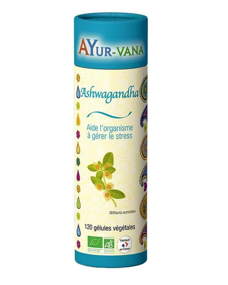 L'Ashwagandha d'AYur-vana est un complément alimentaire bio, présenté en gélules végétales, pour un produit fabriqué en France et adapté aux régimes vegan et végétarien.