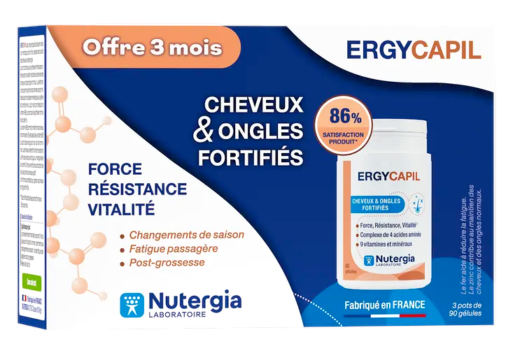 ERGYCAPIL pourra être conseillé pour renforcer les cheveux ternes, fragilisés et ayant tendance à la chute et fortifier les ongles striés et cassants.