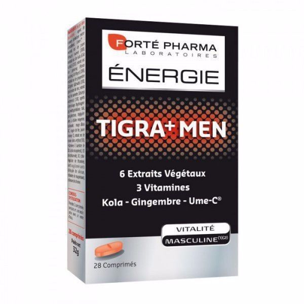 FORTE PHARMA TIGRA + Men présente deux actions majeures contribuant à dynamiser l'énergie sexuelle masculine. La stimulation du désir : Pour favoriser cette stimulation, Tigra Men associe Gingembre, Ginseng et huiles essentielle de Sarriette traditionnellement reconnus pour leurs vertus aphrodisiaques, c’est-à-dire leur capacité à améliorer désir et libido. L'optimisation des performances sexuelles : Pour optimiser les performances sexuelles, Tigra Men associe des phyto-actifs protecteurs des structures vasculaires et des substances naturelles améliorant la micro-circulation. L'Ume-c, extrait innovant de prune du japon et le kola, stimulant nerveux et musculaire, améliore l'afflux sanguin vers les tissus sexuels. Le zinc, le chrome et la vitamine B1, en participant à la régulation de l'équilibre nerveux, interviennent sur la conduction nerveuse du désir.