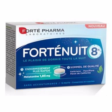 Forté Nuit 8h est une solution naturelle et sans accoutumance, pour retrouver un sommeil de qualité et se réveiller en plaine forme. Forté Nuit 8h des laboratoires Forté Pharma permet un endormissement plus rapide et un sommeil réparateur de meilleure qualité grâce à son double effet immédiat et prolongé. Forté Nuit 8h est disponible en boîte de 15 comprimés.