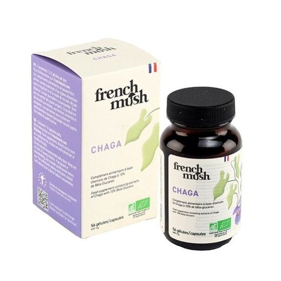 Chaga Bio de French Mush, complément alimentaire riche en antioxydants, conçu pour renforcer l'immunité, améliorer la digestion et revitaliser l'organisme.