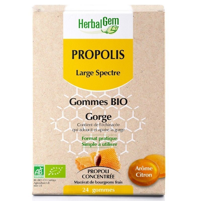 Propolis bio, sous forme de gomme à mâcher, à base de propolis concentrée et d'échinacée, pour adoucir et apaiser la gorge mais aussi pour permettre de passer un hiver en toute tranquillité.