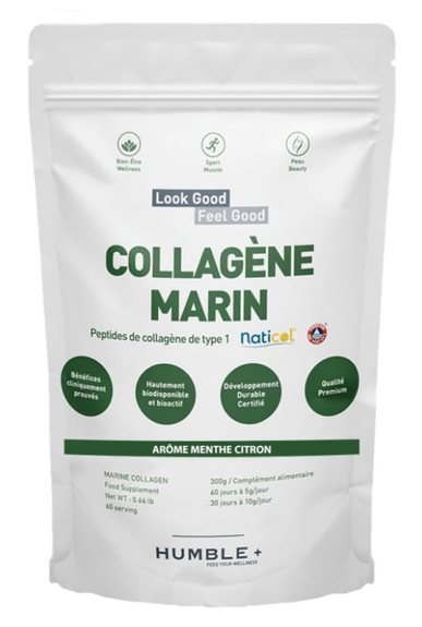 Le collagène marin améliore la fermeté et l'élasticité de la peau. Il contient des peptides de collagène hydrolysé de type I. Ces peptides sont facilement assimilables, avec une taille de 2000 à 4000 Daltons. Son efficacité a été prouvée par trois études cliniques.