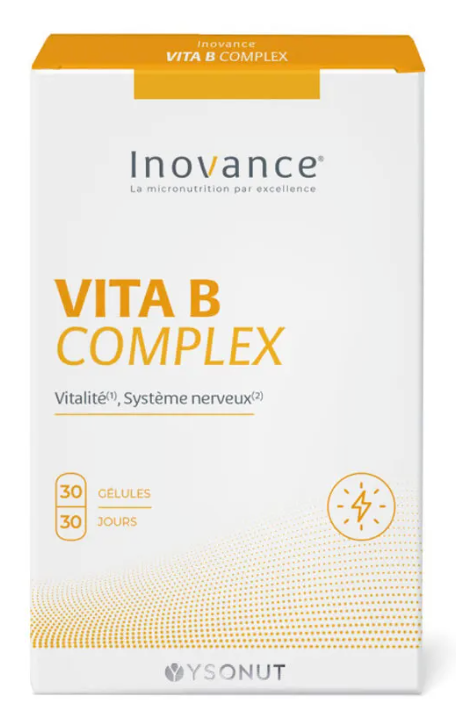 VITA B COMPLEX combine 8 vitamines du groupe B (B1, B2, B3, B5, B6, B8, B9, B12) offrant une biodisponibilité optimale. Elles contribuent à réduire la fatigue et au bon fonctionnement du système nerveux.
