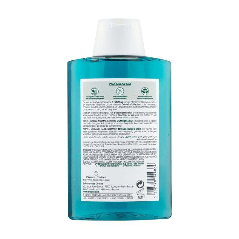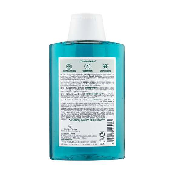 DescriptionUn souffle de fraîcheur détox pour vos cheveux en villeVos cheveux subissent chaque jour les agressions de la pollution urbaine ? Le shampoing détoxifiant à la menthe aquatique bio de Klorane est là pour les purifier en profondeur, sans compromis sur la douceur. Conçu pour les citadins, ce soin nettoie les impuretés et particules polluantes tout en respectant léquilibre naturel du cuir chevelu. Sa formule biodégradable, riche en antioxydants, offre une expérience sensorielle unique : une fraîcheur tonifiante de menthe écrasée qui réveille les sens à chaque lavage. Une formule respectueuse, pour des cheveux légers et brillantsAvec sa texture légère et transparente, ce shampoing pénètre rapidement pour éliminer les résidus de pollution sans alourdir ni assécher. Les cheveux retrouvent leur éclat naturel, tout en bénéficiant dune sensation de légèreté et de propreté durable. Son usage quotidien est recommandé pour un effet détox optimal, idéal pour ceux qui cherchent à préserver la santé de leurs cheveux malgré un environnement urbain. Engagé pour la planète, sans sacrifier lefficacitéKlorane va plus loin en proposant un emballage éco-conçu : composé à 82 % de matériaux recyclés et entièrement recyclable, il sinscrit dans une démarche responsable. La formule, biodégradable selon le test OECD 301 B, garantit un impact minimal sur lenvironnement, tout en offrant une performance nettoyante et hydratante. Un geste simple pour vos cheveux et pour la planète. Depuis plus de 50 ans, Klorane allie expertise botanique et innovation pour créer des soins capillaires et dermatologiques inspirés par la nature. Marque française engagée, elle mise sur des formules douces, efficaces et respectueuses de lenvironnement, avec une attention particulière portée aux ingrédients dorigine végétale. Reconnue pour ses gammes dédiées aux besoins spécifiques des cheveux et du cuir chevelu, Klorane simpose comme un acteur de confiance pour une beauté responsable.Liste des avantages du produitDécouvrez les avantages du shampoing détoxifiant à la menthe aquatique bio Klorane : Nettoie en profondeur les cheveux Élimine les particules polluantes Procure une fraîcheur tonifiante Respecte le cuir chevelu sensible Laisse les cheveux légers et brillants Formule biodégradable et douceConseils d'utilisationAppliquez une noisette de shampoing Klorane à la menthe aquatique bio sur cheveux mouillés, puis massez délicatement le cuir chevelu pour faire mousser. Insistez sur les zones exposées à la pollution pour éliminer efficacement les particules et impuretés. Rincez abondamment à leau tiède. Pour un effet détox optimal, utilisez ce shampoing quotidiennement. Sa formule douce respecte léquilibre naturel de vos cheveux et de votre cuir chevelu, tout en procurant une sensation de fraîcheur immédiate grâce à son parfum tonifiant de menthe écrasée.CompositionAqua - Sodium Laureth Sulfate - Cocamidopropyl Betaine - Sodium Chloride - Mentha Aquatica Leaf Water* (EAU DE FEUILLE DE MENTHE AQUATIQUE*) - Glycerin - Sodium Benzoate (Conservateur) - Citric Acid (Stabilisant) - Parfum/Fragrance (MENTHE, LIMONENE) - Sodium Hydroxide - Disodium EDTA - CI 19140 (Colorant) - CI 42090 (Colorant) - *Ingrédient issu de l'agriculture biologique