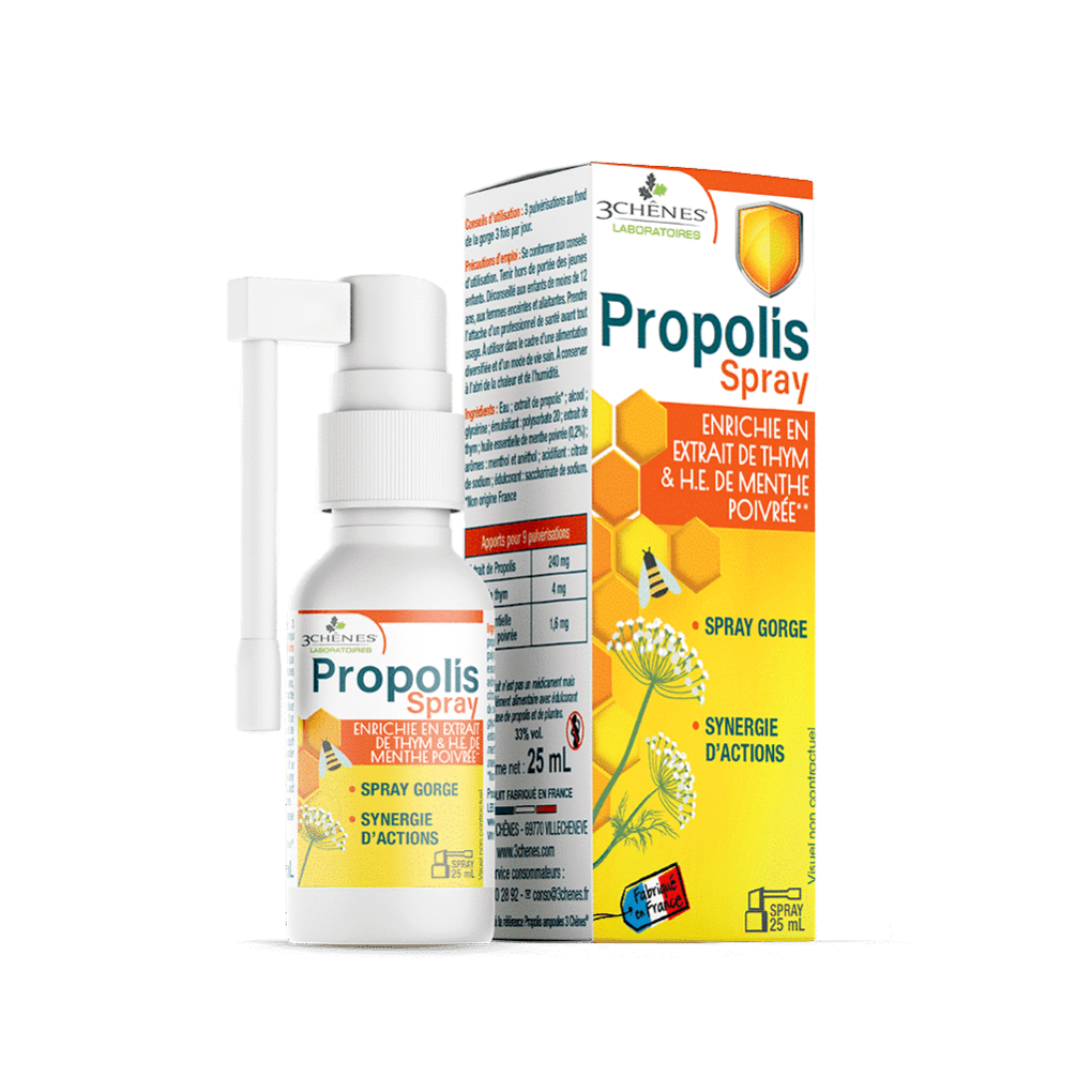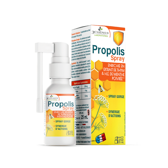 Le spray propolis du laboratoire Les 3 Chênes, pour la gorge, contient :