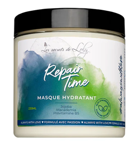 Le Masque crème hydratant Repair Time est élaboré à base d'aloe vera, de macadamia, de jojoba, de glycérine, de provitamine B5 et des huiles essentielles de bois de rose et de pamplemousse. Ce masque contient un actif cosmétique fortifiant : la provitamine B5. Elle rend le cheveu plus fort et plus brillant. C'est l'actif idéal pour les cuirs chevelus sensibles et sujets aux démangeaisons. Adapté à tous les types de cheveux, il ravira les personnes aux cheveux difficiles à démêler, fourchus et secs. Il rend les cheveux doux, soyeux, sans les étouffer. L'huile essentielle de pamplemousse est photosensibilisante.