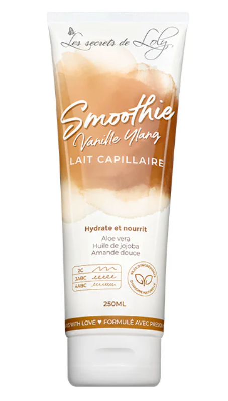 Formulé à 99,2 % d’origine naturelle, le Smoothie Vanille Ylang-Ylang est un complexe hydratant riche en aloe vera, en beurre de mangue, en huile d’amande douce et de jojoba qui apportera toute la nutrition nécessaire à vos cheveux. Ce smoothie répare, protège, adoucit et limite les fourches. Son odeur envoûtante de Vanille et d’Ylang-Ylang et sa texture lactée vous rappelleront l'été ! Convient aux cheveux frisés et crépus.