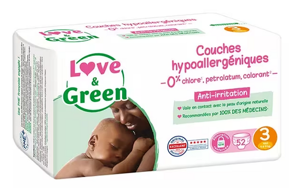 Les couches hypoallergéniques ultra-absorbantes Love & Green offrent jusqu’à 12h de protection pour bébé et sont recommandées par 100% des médecins*! Sans ingrédient indésirable, elles prennent soin de sa peau fine et fragile dès la naissance et sont adaptées à tous les types de peau.