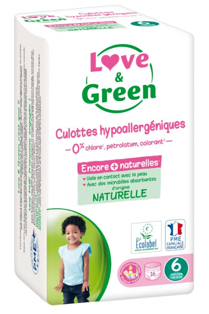 Love & Green Culottes Hypoallergéniques 16 Culottes Taille 6 (+ 16 kg) sont des culottes conçues avec des microbilles absorbantes d'origine naturelles basées sur la biomasse :