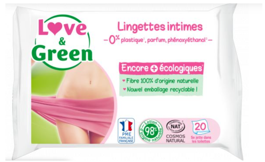 Conditionnées en paquet de 20, les lingettes intimes apaisantes Love and Green offrent une sensation de fraîcheur tout au long de la journée pour un usage quotidien. Elles ne contiennent pas de perturbateurs endocriniens et sont imprégnées d’une lotion 99,7% naturelle. Les lingettes sont hypoallergéniques et testées sous contrôle dermatologique et gynécologique.