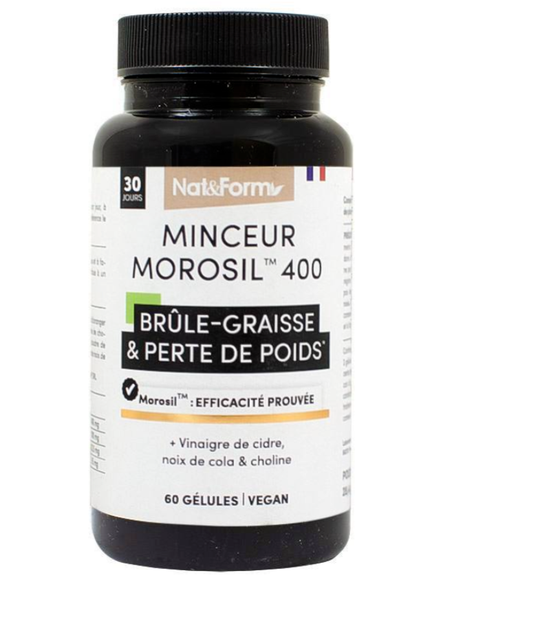 Morosil™ : extrait de fruit d'oranger doux (Citrus sinensis), bitartrate de choline, poudre de vinaigre de cidre (Malus pumila), poudre de noix de cola (Cola nitida). Gélule d'origine végétale (HPMC).
