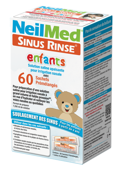 Posologie : Enfants de 2 ans et plus : 1 sachet dans 120 ml d'eau indiquée pour l'irrigation nasale, 1 à 6 fois par jour.