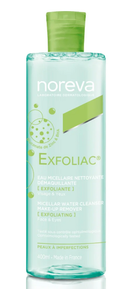 Noreva Exfoliac Eau Micellaire Purifiante 500 ml est une lotion micellaire légère sans rinçage pour les peaux à imperfections, qui nettoie, démaquille, assainit et rafraîchit le visage et les yeux, laissant une peau nette, matifiée et purifiée.