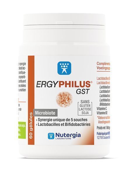ERGYPHILUS® GST est un complément alimentaire constitué d’une synergie unique de 5 souches vivantes. Il contient des lactobacilles et bifidobactéries rigoureusement sélectionnés pour leurs propriétés :