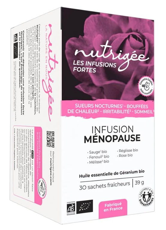 L’Infusion Ménopause Nutrigee, certifiée BioPartenaire®, associe des plantes bio d’excellence telles que la sauge, la mélisse, le fenouil et le géranium pour vous aider à réduire naturellement les bouffées de chaleur, les sueurs nocturnes, l’irritabilité et les troubles du sommeil. 100 % bio et fabriquée en France, cette infusion offre un soutien apaisant au quotidien. Elle se combine parfaitement avec notre complément Nutripause pour une action complète et durable sur le confort de la ménopause.
