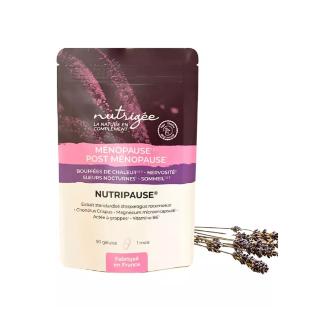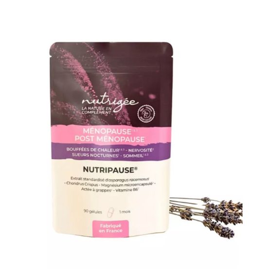Nutripause des Laboratoires Nutrigée, complément alimentaire qui réduit bouffées de chaleur, sueurs nocturnes et irritabilité, tout en favorisant un sommeil réparateur et un équilibre nerveux optimal.