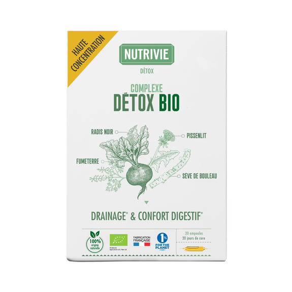 Le Complexe Détox BIO Nutrivie, composé de Bouleau, de Pissenlit, de Radis noir et de Fumeterre, vous aidera à détoxifier votre organisme.