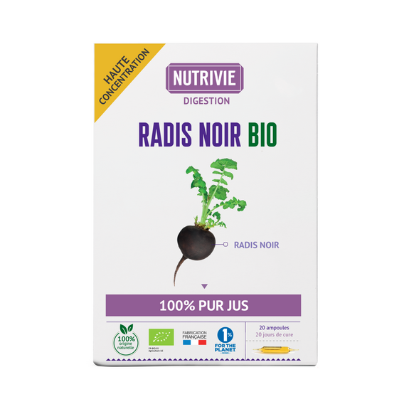 Naturellement présent dans votre complément alimentaire Nutrivie, le Radis noir est une plante herbacée couramment cultivée comme condiment. C'est sa racine, sombre à l'extérieur et blanche à l'intérieur, qui est consommée.