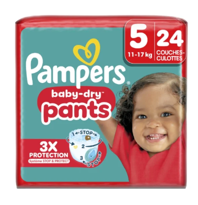 Lorsque votre bébé commence à bouger de plus en plus, il vous faut des couches-culottes qui suivent tous ses mouvements. Grâce à leur système Stop & Protect révolutionnaire, les couches-culottes Pampers Baby-Dry Pants offrent une protection intégrale supérieure contre les fuites, quelle que soit la position dans laquelle votre bout de chou se trouve, jour et nuit. Le système Stop & Protect de Pampers Baby-Dry Pants comprend : des barrières anti-fuites 2 x plus larges* qui aident à éviter les fuites au niveau des jambes, une poche qui aide à capturer les fuites à l'arrière, une ceinture flexible 360°, qui épouse les contours du corps de votre tout-petit quand il bouge et un cœur super absorbant offrant jusqu'à 12 heures de protection. Comme toutes nos couches-culottes, les couches-culottes Pampers Baby-Dry Pants sont faciles à changer même lorsque votre bébé gigote : faciles à enfiler en un seul geste, faciles à retirer en déchirant les côtés, et faciles à jeter en les enroulant grâce à la bande adhésive. Comme pour vous, la sécurité de votre bébé est notre priorité : Les couches-culottes Pampers Baby-Dry Pants sont approuvées dermatologiquement et contiennent 0% d'allergènes de parfum listés par l'UE (comme réglementé par la réglementation cosmétique de l'UE N°1223/2009). Elles sont approuvées par les dermatologues de la Skin Health Alliance et testées et certifiées Standard 100 par OEKO-TEX. Vous souhaitez en savoir plus sur la composition de nos produits Pampers ? Visitez pampers.fr. *par rapport à avant.