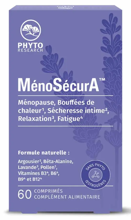 MénoSécurA est un complément alimentaire du laboratoire Phytoresearch recommandé au cours de la ménopause, pour les bouffées de chaleur, la sécheresse intime, la relaxation et en cas de fatigue.