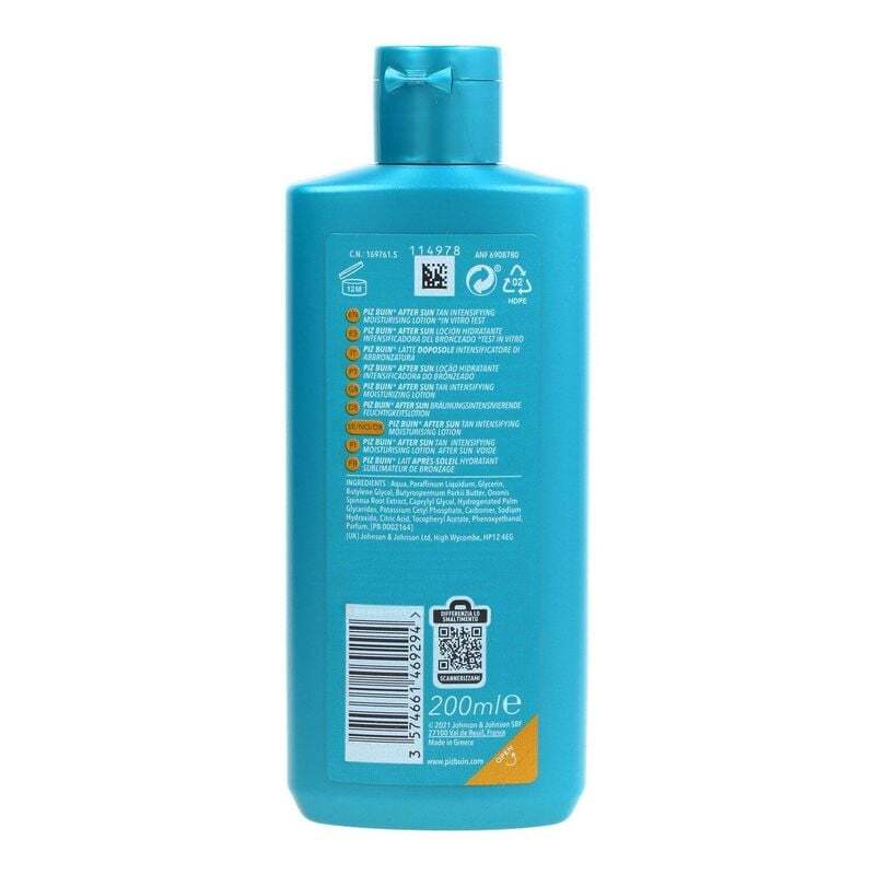 DescriptionUn bronzage sublime, même après le coucher du soleilLa lotion Après-Soleil Piz Buin 200 ml est bien plus quun simple soin hydratant : cest un véritable allié pour sublimer et prolonger votre bronzage tout en prenant soin de votre peau après une exposition au soleil. Conçue pour agir en profondeur, elle répare, apaise et prépare votre épiderme pour les prochaines journées ensoleillées. Une hydratation intense pour une peau douce et soupleAprès une journée sous le soleil, votre peau a besoin dune hydratation puissante pour retrouver son équilibre. Cette lotion offre jusquà 24 heures dhydratation, grâce à une formule enrichie en glycérine et en beurre de karité, qui restaurent leau perdue et préservent la souplesse de votre peau. Fini les tiraillements et les desquamations, place à une peau nourrie et confortable. Un bronzage qui dure, grâce à la scienceLe secret ? Le Tanimel, un actif révolutionnaire dérivé de la plante ononis (ou bugrane), qui stimule la production naturelle de mélanine jusquà 133 %. Résultat : votre bronzage sintensifie et se prolonge, même après votre retour de vacances. Associée à la vitamine E, un puissant antioxydant, cette lotion protège également votre peau des radicaux libres responsables du vieillissement prématuré. Une texture légère pour une absorption immédiatePlus besoin dattendre pour vous habiller ou profiter de votre soirée : cette lotion pénètre rapidement sans laisser de film gras. Sa formule légère et non collante en fait un soin agréable à appliquer, idéal pour une utilisation quotidienne après chaque exposition au soleil. Parfaite pour toute la famille, elle revitalise la peau et la prépare en douceur pour les prochains rayons UV. Depuis plus de 70 ans, Piz Buin est synonyme dexpertise solaire et de soins innovants pour la peau. Marque pionnière dans le domaine de la protection solaire, elle allie science et nature pour offrir des produits performants, adaptés à tous les types de peau et à toutes les envies de bronzage. Avec Piz Buin, le soleil rime avec plaisir, sécurité et beauté durable.Liste des avantages du produitProlonge et intensifie le bronzage Hydratation intense 24 heures Prévient la desquamation cutanée Absorption rapide et légère Nourrit avec beurre de karité Protège contre les radicaux libresConseils d'utilisationAppliquez la Lotion Après-Soleil Piz Buin sur une peau propre et sèche après chaque exposition au soleil. Étalez une quantité généreuse en massant légèrement jusquà absorption complète pour profiter dune hydratation intense et prolonger votre bronzage. Utilisez-la quotidiennement pour maintenir la souplesse de la peau, éviter la desquamation et préparer votre épiderme à de nouvelles expositions. Sa formule légère pénètre rapidement sans laisser de film gras, idéale pour une utilisation après la plage ou la piscine.CompositionAqua - Glycérine - Alcool dénaturé - Extrait de graines d'Helianthus Annuus (TOURNESOL) - Huile de fruit d'Olea Europaea (OLIVE) - Butyrospermum Parkii Butter (BEURRE DE KARITÉ) - Tanimel (extrait de plante Ononis) - Tocophérol (Vitamine E) Antioxydant : - Parfum (contient des allergènes : LIMONÈNE, LINALOOL, CITRONELLOL, BENZYL BENZOATE, ALPHA-ISOMETHYL IONONE, BENZYL ALCOHOL, BENZYL SALICYLATE, HEXYL CINNAMAL, CITRAL, GERANIOL) - Conservateur : Phénoxyéthanol