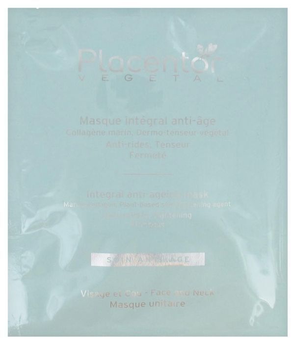 Le Masque intégral Anti-âge de PLACENTOR VEGETAL est un soin unique au collagène marin qui prévient et atténue les rides, d'un dermo-tenseur végétal issu d'arbres exotiques (Quillaja et Kigelia) qui lisse la peau pour un effet tenseur et raffermissant et de placenta végétal pour stimuler la régénération cellulaire et apporter une hydration immédiate et durable. Il s'applique sur le visage ainsi que le cou, agissant comme un anti-rides pour atténuer les signes du vieillissement cutané. C'est un masque tissu doux, prêt à l’emploi, imbibé d’un gel riche en actifs végétaux aux propriétés anti-âge. Il peut-être recommandé en complément de soins esthétiques ou dermatologiques.
