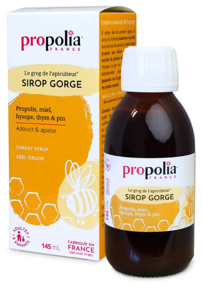 La formule traditionnelle du Sirop Gorge de Propolia® allie tous les atouts des produits de la Ruche (Miel, Propolis) aux huiles essentielles et extraits de plantes tels que le Thym, l’Hysope et la Mauve, apaisants pour la gorge.