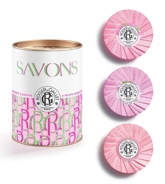 Ce coffret réunit trois savons : Rose, Feuille de Thé et Rose Thé. Le savon Rose, aux notes délicates, révèle un parfum captivant de Rose Damascena. Le savon Feuille de Thé marie la douceur chaleureuse du thé noir à l’éclat frais du citron de Calabre. Enfin, Rose Thé permet de redécouvrir un grand classique de la marque : la réédition d’un savon créé au début du XXe siècle, aux accords subtils de fleurs et d’agrumes.