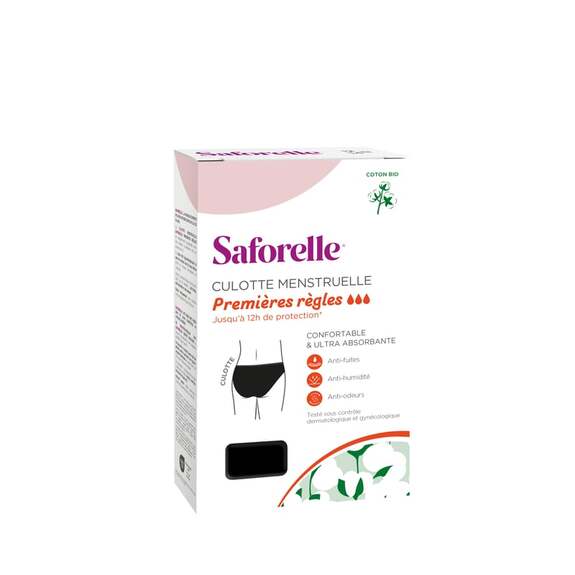 DescriptionUne protection menstruelle douce et rassurante pour les premières règlesDécouvrez la culotte menstruelle Saforelle, spécialement conçue pour accompagner les jeunes filles de 12 à 14 ans lors de leurs premières règles. Avec une taille adaptée à un tour de hanches de 77 à 81 cm, elle offre une solution discrète, confortable et sécurisante pour aborder cette nouvelle étape en toute sérénité. Son design sobre et sa couleur noire en font un allié discret, que ce soit à lécole, pendant le sport ou la nuit. Une absorption optimale pour une protection longue duréeAvec une capacité dabsorption équivalente à 4 tampons pour flux abondant, cette culotte menstruelle assure une protection fiable jusquà 12 heures. Grâce à sa technologie multicouche (5 à 6 couches absorbantes), elle garantit une sensation de sécheresse tout en neutralisant les odeurs. La couche en contact avec la peau est en coton bio hypoallergénique, pour un confort optimal et une tolérance parfaite, même pour les peaux les plus sensibles. Une solution écologique, saine et pratique au quotidienLavable et réutilisable, cette culotte menstruelle est une alternative durable aux protections jetables. Certifiée Oeko-Tex® et sans absorbants chimiques, elle respecte à la fois la santé des jeunes filles et lenvironnement. Testée cliniquement sur 25 adolescentes, elle a été validée par des dermatologues et gynécologues pour une utilisation sans risque, jour et nuit. Un choix malin pour allier confort, sécurité et respect de la planète. Saforelle est une marque engagée dans le bien-être intime, spécialisée dans les solutions douces et respectueuses pour les peaux sensibles. Reconnue pour ses produits testés dermatologiquement et gynécologiquement, elle allie innovation et naturalité pour offrir des protections menstruelles sûres, écologiques et adaptées à chaque étape de la vie. Avec Saforelle, prenez soin de votre intimité en toute confiance.Liste des avantages du produitDécouvrez les avantages de la culotte menstruelle Saforelle pour les premières règles : Ultra-absorbante et sécurisante Coton bio hypoallergénique Anti-fuites et anti-odeurs Testée dermatologiquement et gynécologiquement Lavable et réutilisable Confort jour et nuitConseils d'utilisationPour utiliser la culotte menstruelle Saforelle pour les premières règles, commencez par la choisir en fonction de votre taille (tour de hanches entre 77 et 81 cm). Portez-la comme une culotte classique, en veillant à ce quelle soit bien ajustée pour éviter les fuites. Elle peut être portée jusquà 12 heures daffilée, de jour comme de nuit, et convient aussi bien pour les activités quotidiennes que pour le sport. Après utilisation, rincez-la à leau froide avant de la laver en machine à 40°C, sans adoucissant ni blanchissant, pour préserver ses propriétés absorbantes et sa durabilité. Séchez-la à lair libre pour une meilleure conservation.CompositionComposition : Coton biologique (95%) - Élasthanne (5%) (couches absorbantes) - Polyamide (80%) - Élasthanne (20%) (culotte) - Polyester enduit de polyuréthane (100%) (couche imperméable) - Polyamide (92%) - Élasthanne (8%) (élastiques).