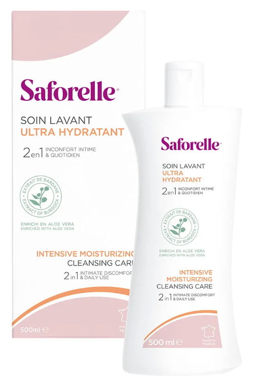 Le Soin Lavant Ultra Hydratant Saforelle® a été spécialement formulé pour la toilette intime et corporelle des femmes présentant une sécheresse intime externe. Ce soin 2 en 1, à l'extrait de Bardane et d'Aloe Vera apaise les sensations de tiraillements et de sécheresse intime et hydrate. Il respecte la zone intime et peut s'utiliser en cas d'inconfort ou au quotidien. Formulation douce et sans savon. Testé sous contrôle gynécologique et dermatologique.
