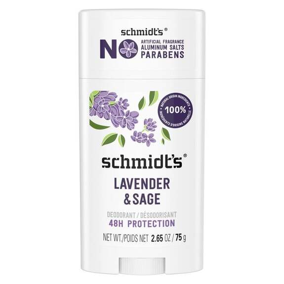 DescriptionUn déodorant naturel qui allie efficacité et douceur pour une protection longue duréeDécouvrez le déodorant stick Schmidt's à la Lavande & Sauge, une solution 100 % naturelle pour neutraliser les odeurs tout au long de la journée. Avec une formule certifiée vegan et sans cruauté, ce déodorant offre une protection allant jusquà 48 heures, sans compromis sur votre bien-être ou celui de la planète. Son format stick pratique et sa texture non grasse en font un allié du quotidien, adapté à tous les types de peau. Une formule clean, respectueuse de votre peau et de lenvironnementLibre de sels daluminium, dalcool, de parabènes et de fragrances artificielles, ce déodorant mise sur des ingrédients dorigine naturelle comme le beurre de karité, lhuile de coco et lhydroxyde de magnésium pour neutraliser les odeurs efficacement. Enrichi en huiles essentielles de lavande et de sauge, il apporte une touche herbacée et apaisante, tout en respectant les peaux les plus sensibles. Sa certification Ecocert et son engagement vegan en font un choix responsable, sans ingrédients superflus ni compromis. Un geste simple pour une efficacité immédiateAvec une application en 1 à 2 passages sur une peau propre et sèche, ce déodorant stick agit en moins dune minute pour vous offrir une sensation de fraîcheur durable. Son format compact (75 g) se glisse facilement dans un sac ou une trousse de toilette, idéal pour une utilisation à la maison comme en déplacement. Que ce soit pour une journée au bureau ou une séance de sport, Schmidt's Lavande & Sauge sadapte à tous les moments de la vie, sans laisser de résidus collants ou de traces sur les vêtements. Schmidt's est une marque engagée qui repense la cosmétique naturelle avec des produits efficaces et respectueux de lenvironnement. Depuis ses débuts, elle mise sur des formules clean, sans ingrédients controversés, tout en garantissant une protection optimale contre les odeurs. Certifiée vegan et cruelty-free, Schmidt's allie innovation et éthique pour offrir des déodorants qui prennent soin de votre peau et de la planète.Liste des avantages du produitProtection 24 h/48 h contre les odeurs Formule 100% naturelle et vegan Sans sels d'aluminium ni parabènes Parfum doux lavande & sauge Texture non grasse et non collante Certifié Ecocert et cruelty-freeConseils d'utilisationPour une utilisation optimale du déodorant stick Schmidt's Lavande & Sauge, appliquez simplement 1 à 2 passages légers sur une peau propre et sèche, sous les aisselles. Laissez sécher une minute avant de vous habiller pour une efficacité maximale. Ce déodorant naturel offre une protection contre les odeurs pendant 24 à 48 heures sans laisser de résidus gras ou collants. Sa formule douce et vegan convient à tous les types de peau et sutilise au quotidien sans irritation.CompositionHydroxyde de magnésium (neutralise les odeurs) - Huile de coco (Cocos nucifera oil) - Poudre darrow-root (Maranta arundinacea root powder) - Huile de coco fractionnée (Cocos nucifera oil) - Beurre de karité (Butyrospermum parkii butter) - Bicarbonate de soude - Vitamine E (tocophérol) - Huile de Lavandula angustifolia (lavande) - Huile de Salvia sclarea (sauge sclarée) (LAVANDE, SAUGE) - Cire de candelilla (Euphorbia cerifera wax) (Agent denrobage)