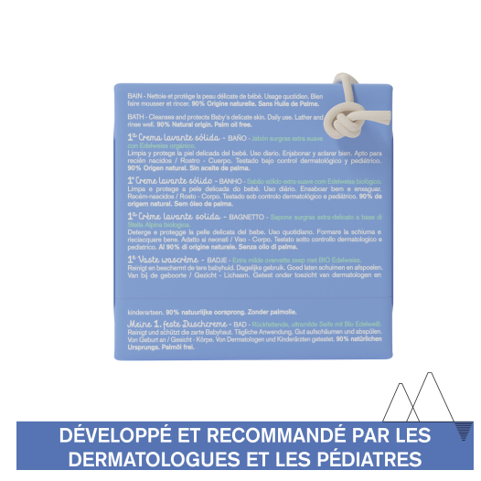 Cette crème lavante solide, nettoie et protège la peau délicate de bébé. Sa formule au complexe [Eau thermale d’Uriage + Edelweiss bio] apporte un confort immédiat.