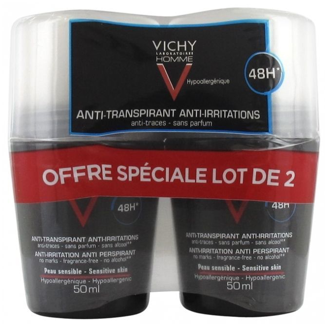 Vichy Homme Déodorant Anti-Transpirant Anti-Irritations 48H Roll-On Lot de 2 x 50 ml est un déodorant pour les hommes qui recherchent une efficacité déodorante et anti-transpirante longue durée. Il est spécialement dédié aux peaux sensibles.