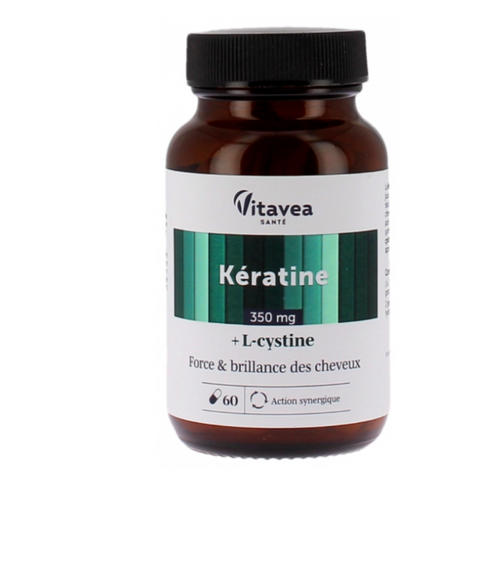 Vitavea Kératine 350 mg 60 Gélules aide à renforcer la structure capillaire de l'intérieur.